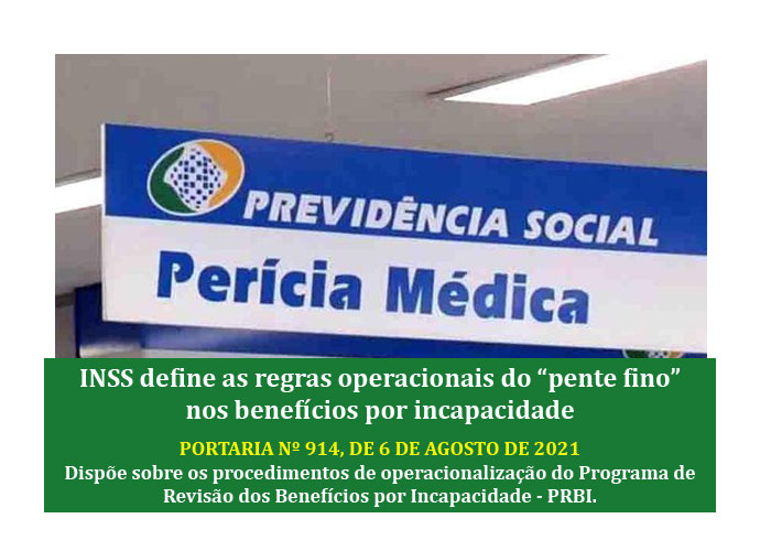 Foi publicada em 09/08/2021 pela Diretoria de Benefícios do Instituto Nacional do Seguro Social a PORTARIA Nº 914, DE 6 DE AGOSTO DE 2021 que dispõe sobre os procedimentos de operacionalização do Programa de Revisão dos Benefícios por Incapacidade – PRBI.