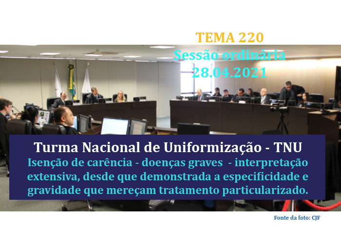 A Turma Nacional de Uniformização (TNU), em sessão ordinária de 28.04.2021, firmou entendimento de que o rol de doenças graves que permitem a dispensa da carência para a concessão de benefício por incapacidade, previsto inicialmente no artigo 151 da Lei 8.213, de 1991, não é taxativo, sendo admitida interpretação extensiva em razão da especificidade e particularidade da enfermidade que exija tratamento particularizado.